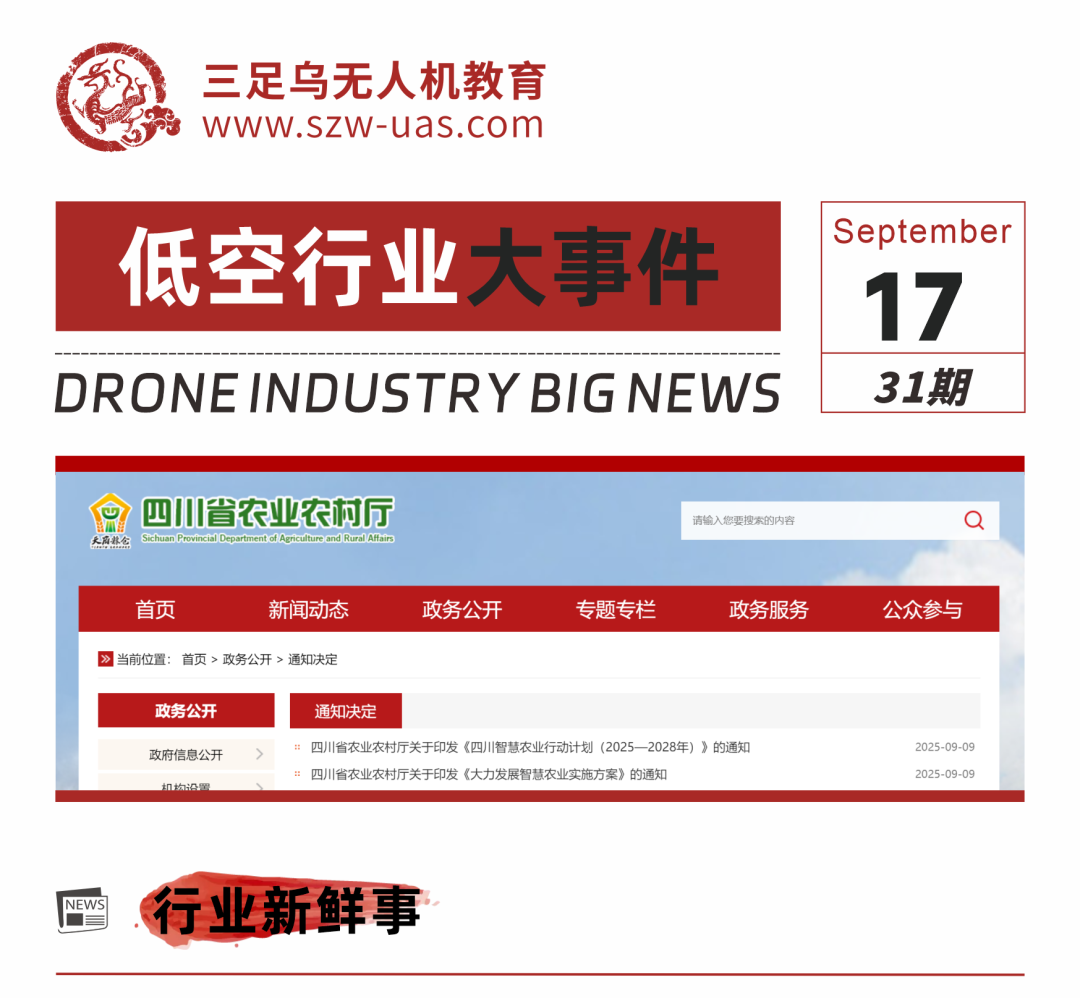 9月9日,四川省农业农村厅发布《大力发展智慧农业实施方案》(川农发〔2025〕19号)及《四川智慧农业行动计划(2025-2028年)》(川农发〔2025〕20号),全面推动智慧农业发展,大力推广农业无人机,培育农业新质生产力。