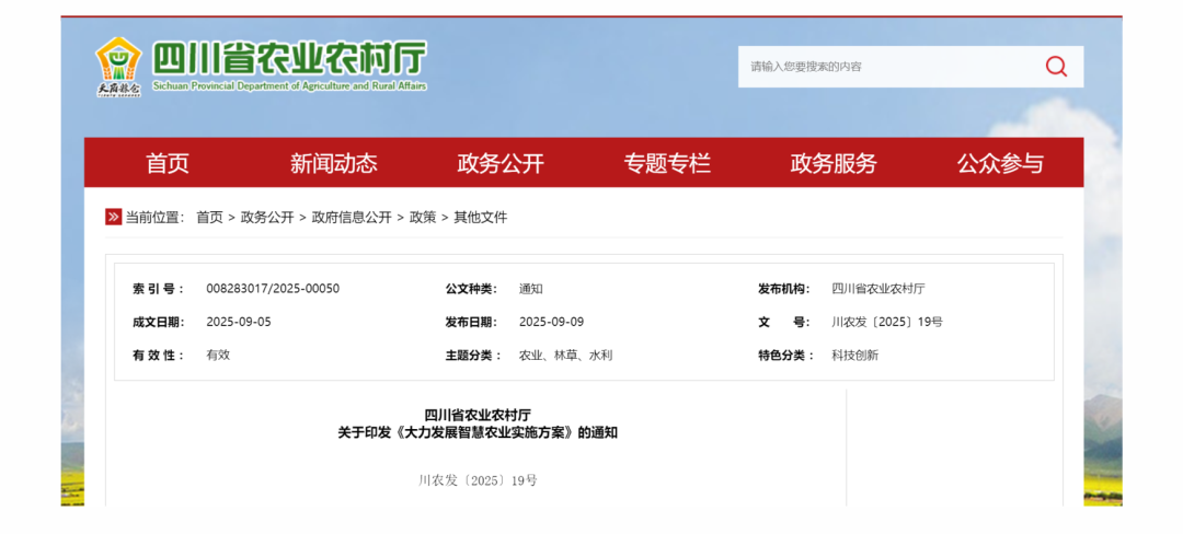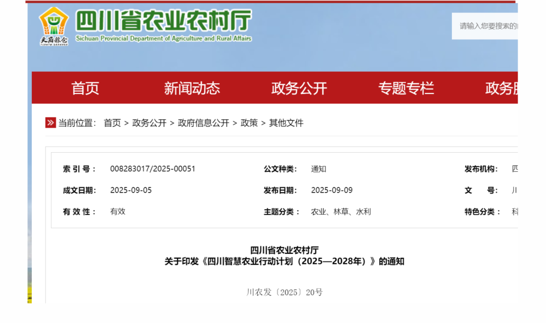 川农发〔2025〕20号《四川智慧农业行动计划(2025-2028年)》提出实施“三大行动”,包括智慧农业公共服务能力提升、重点领域拓展及创新应用,并部署十项重点任务,涵盖建设省级农业农村大数据平台、构建用地“一张图”、提升技术创新、推动单产提升、建设智慧农场、研发智能农机、加强育制种研究、推进先行先试、加快园区数智化及拓展大数据应用等。
