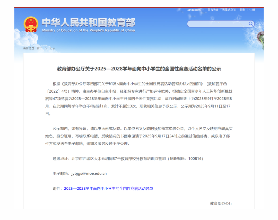近日,教育部办公厅对《2025-2028学年面向中小学生的全国性竞赛活动名单》(俗称“白名单”)进行了公示,共包括全国青少年无人机大赛、全国青少年航天创新大赛、全国青少年模拟飞行锦标赛、“飞向北京·飞向太空”全国青少年航空航天模型教育竞赛活动、全国青少年人工智能创新挑战赛、世界机器人大会青少年机器人设计与信息素养大赛等47项竞赛活动。教育部官网公示内容显示,白名单竞赛举办时间原则上为2025年9月至2028年8月,在此期间每学年举办不得超过1次,累计不超过3次。公示期为2025年9月11日至17日。
