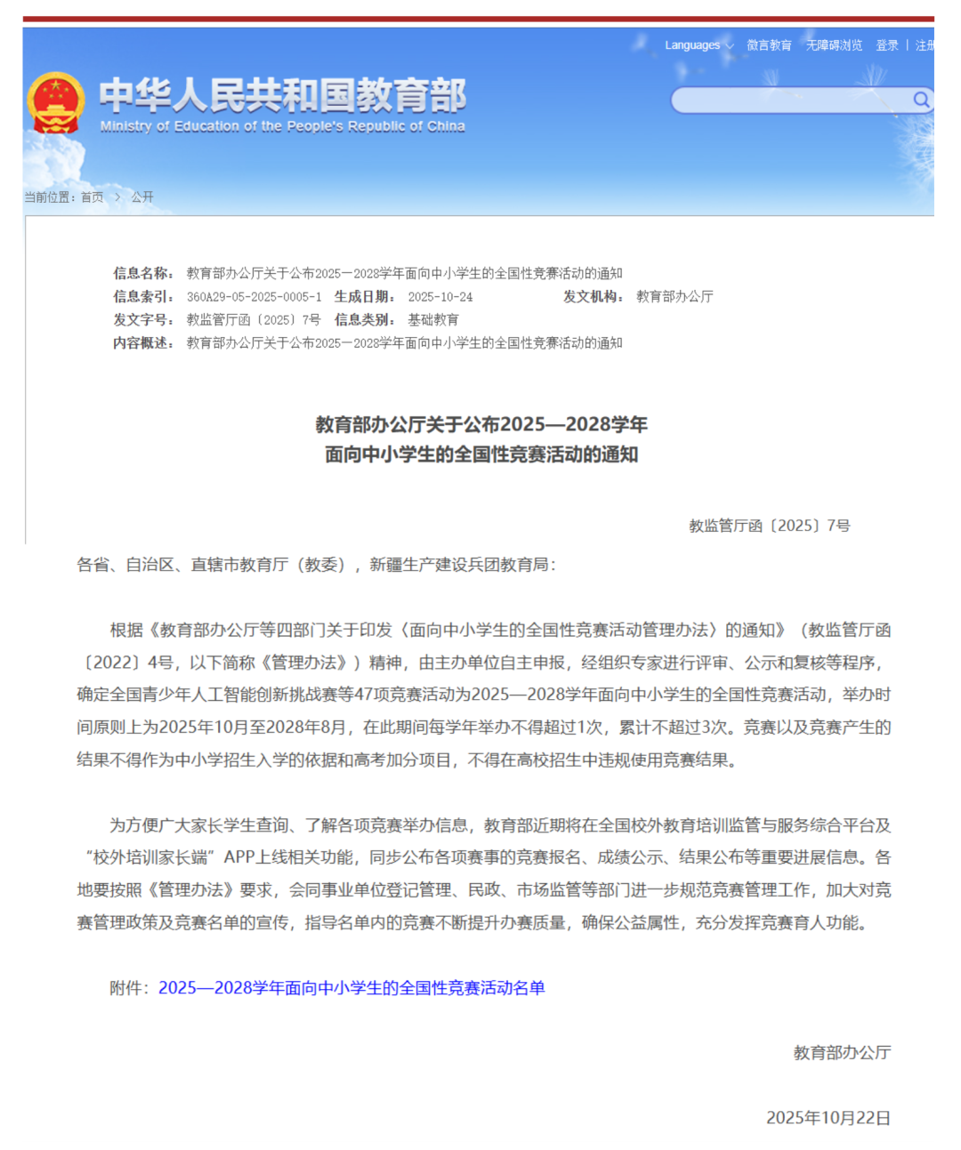 10月22日,教育部办公厅印发教监管厅函〔2025〕7号通知,正式公布《2025—2028学年面向中小学生的全国性竞赛活动名单》(俗称“白名单”),共有全国青少年无人机大赛、全国青少年航天创新大赛、全国青少年模拟飞行锦标赛、“飞向北京·飞向太空”全国青少年航空航天模型教育竞赛活动全国青少年人工智能创新挑战赛、世界机器人大会青少年机器人设计与信息素养大赛等47项竞赛进入白名单。通知明确,入围竞赛的举办时间原则上为2025年10月至2028年8月,在此期间每学年举办不得超过1次,累计不超过3次。竞赛以及竞赛产生的结果不得作为中小学招生入学的依据和高考加分项目,不得在高校招生中违规使用竞赛结果。