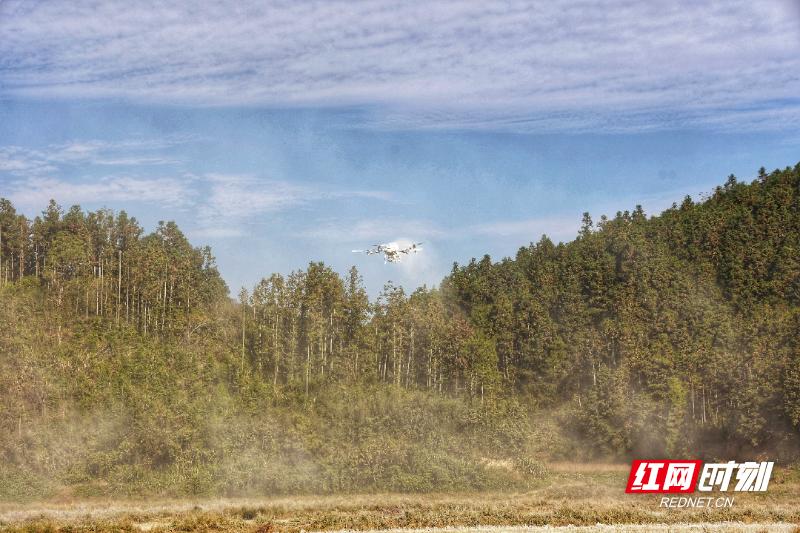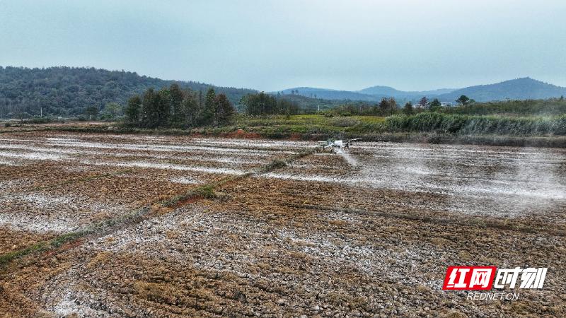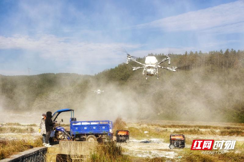 红网时刻新闻11月21日郴州讯(通讯员 陈勇 何禹军 史纯华)11月20日,桂阳县添诚合作社在正和镇极乐村、共和农场罗家村等村开展土壤调理剂播撒作业,无人机“上岗”撒石灰助力农业生产。