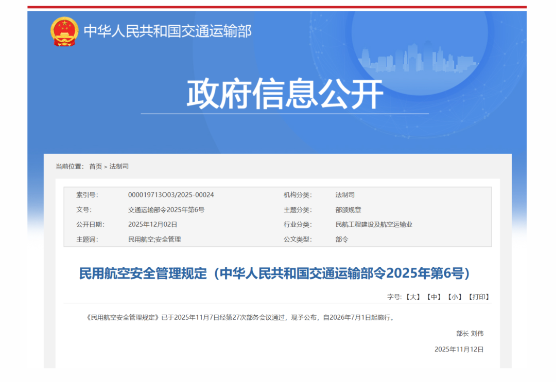 12月2日,交通运输部官网发布《民用航空安全管理规定》(中华人民共和国交通运输部令2025年第6号),共6章45条,包括总则、民航生产经营单位安全管理一般要求、特定民航生产经营单位安全管理体系要求、安全监督管理、法律责任、附则等6方面内容。该本规定自2026年7月1日起施行。交通运输部于2018年2月13日以交通运输部令2018年第3号公布的《民用航空安全管理规定》同时废止。
