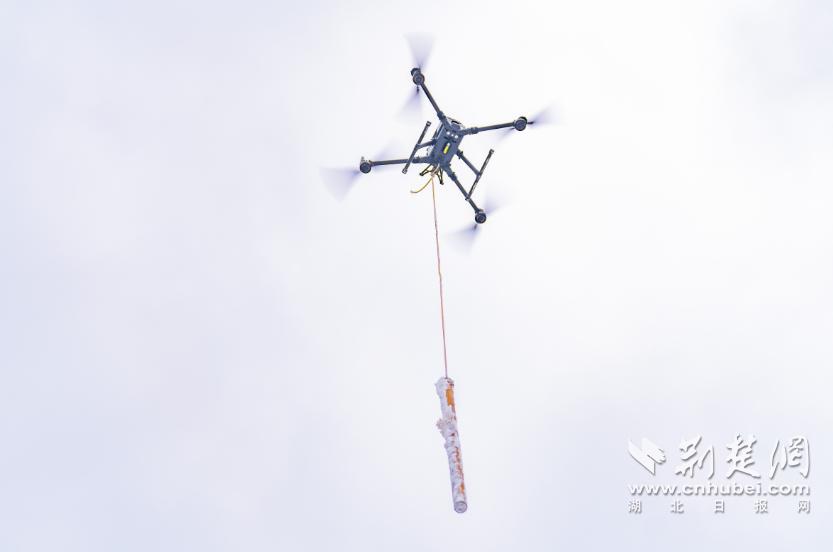 站在输电线路之下,肉眼可见导线上已经附着有颗粒状的冰层。经过对导地线周围雪域环境的严格考量,国网武汉供电公司输电运检分公司运检六班班员柴进操控起无人机升空进行作业。在无人机的下方,挂着一根粗壮的除冰器,接下来就将通过它与输电导线的撞击,来清除覆冰。