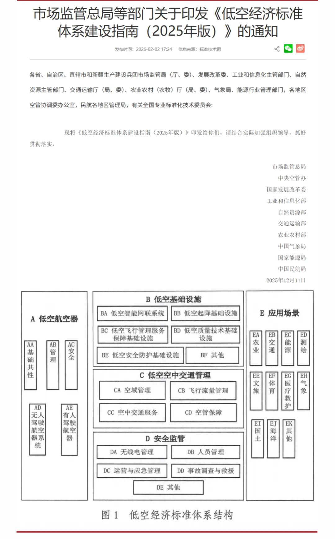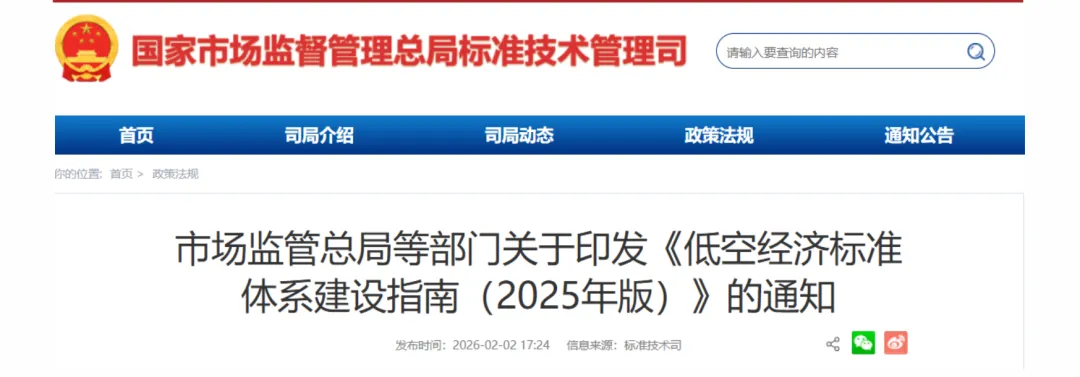 继《低空经济及其核心产业统计分类(试行)》之后,又一国家层面低空经济重磅文件颁布——据市场监管总局、央视新闻2月2日消息,市场监管总局、中央空管办、国家发展改革委、工业和信息化部、自然资源部、交通运输部、农业农村部 中国气象局、国家能源局、中国民航局等十部门近日联合印发《低空经济标准体系建设指南(2025年版)》,重点围绕低空航空器、低空基础设施、低空空中交通管理、安全监管和应用场景五大核心领域,建立技术标准与管理规范融合、国内标准与国际规则融合、强制性标准与推荐性标准融合、基础标准与场景标准融合的“四维融合”标准供给体系。 到2027年,低空经济标准体系基本建立,基本满足低空经济安全健康发展需求。到2030年,低空经济领域标准超过300项 ,结构优化、先进合理、国际兼容的低空经济标准体系基本形成,为低空经济安全健康发展提供有力支撑。