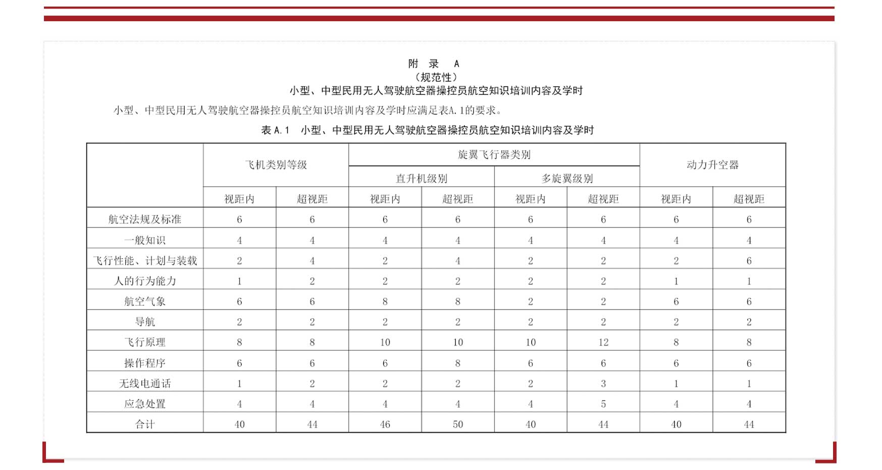 此次发布的《征求意见稿》共包含7章正文,涵盖范围、规范性引用文件、术语和定义、缩略语,以及小型、中型民用无人驾驶航空器操控员航空知识训练要求、操控技能训练要求和教员等级训练要求等内容。标准适用于飞机类别、直升机级别、动力升空器类别等多个等级,并针对视距内运行、超视距运行等不同场景设置了差异化的训练学时与内容。