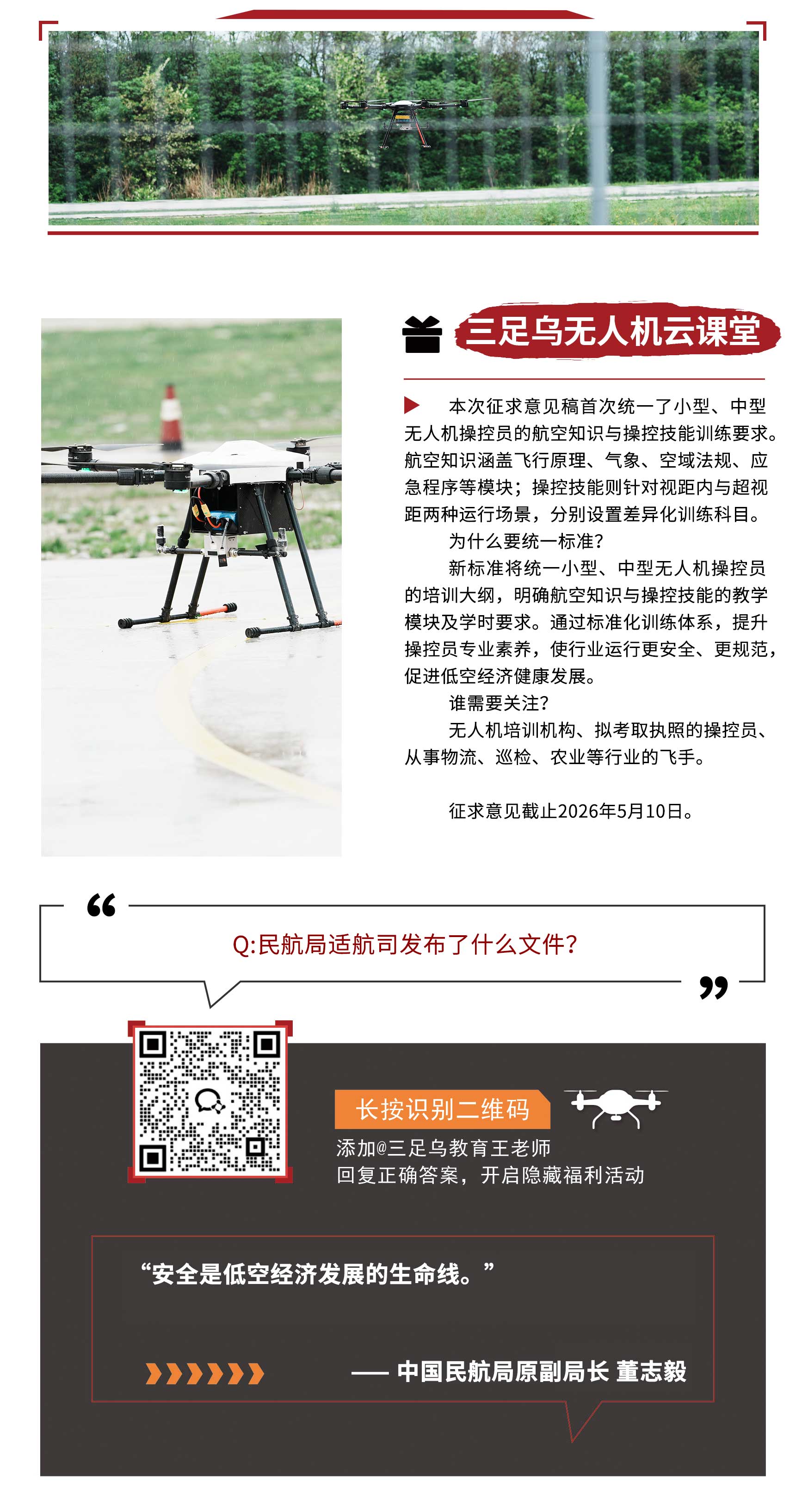 近年来,民用无人驾驶航空器已广泛应用于农业植保、物流配送、应急救援、测绘遥感、电力巡检等领域,行业快速发展对操控员的专业素养提出了更高要求。新标准的出台,将进一步规范操控员的知识结构和技能水平,促进无人机运行更加安全有序。