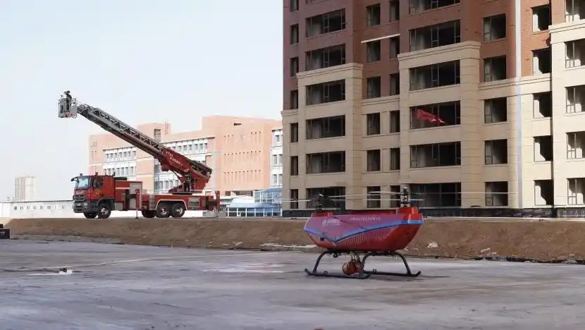演练模拟真实火灾场景,旨在检验航空科技与传统应急救援力量的深度融合效果。在“城市高层建筑灭火”科目中,面对模拟的百米高层火情,无人机挂载专用消防水带吊舱升空,与地面消防车辆构建“天地协同”作战体系。无人机精准悬停于火源窗外,地面供水系统同步加压,形成一条“空中水龙”直击火点,展现突破空间限制、直达火场核心的立体灭火新战法。